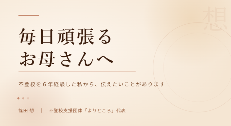 はじめまして。 不登校支援団体「よりどころ」代表の、篠田想と申します。